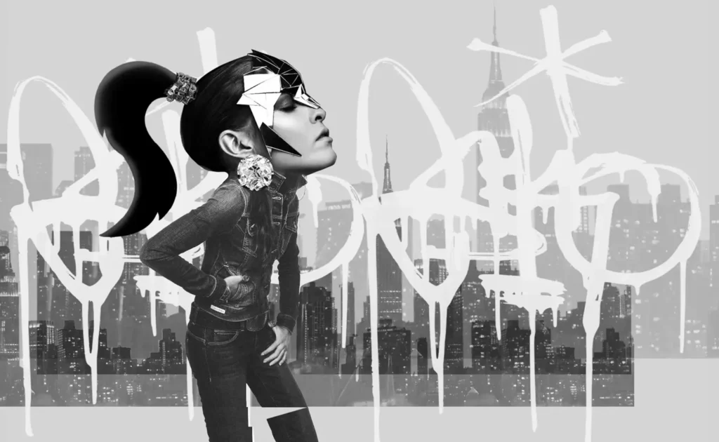 Mark’s journey began with a single fashion illustration created in Photoshop. This initial spark of inspiration, combined with various graffiti samples, laid the stylistic foundation for Grit & Glam. Here, the power of AI is evident from the very beginning. By feeding these elements into Midjourney, Mark utilized AI as a style-reference for image generation. This innovative approach not only expanded his creative boundaries but also allowed for a rapid iteration of designs, enabling him to refine his vision quickly.
